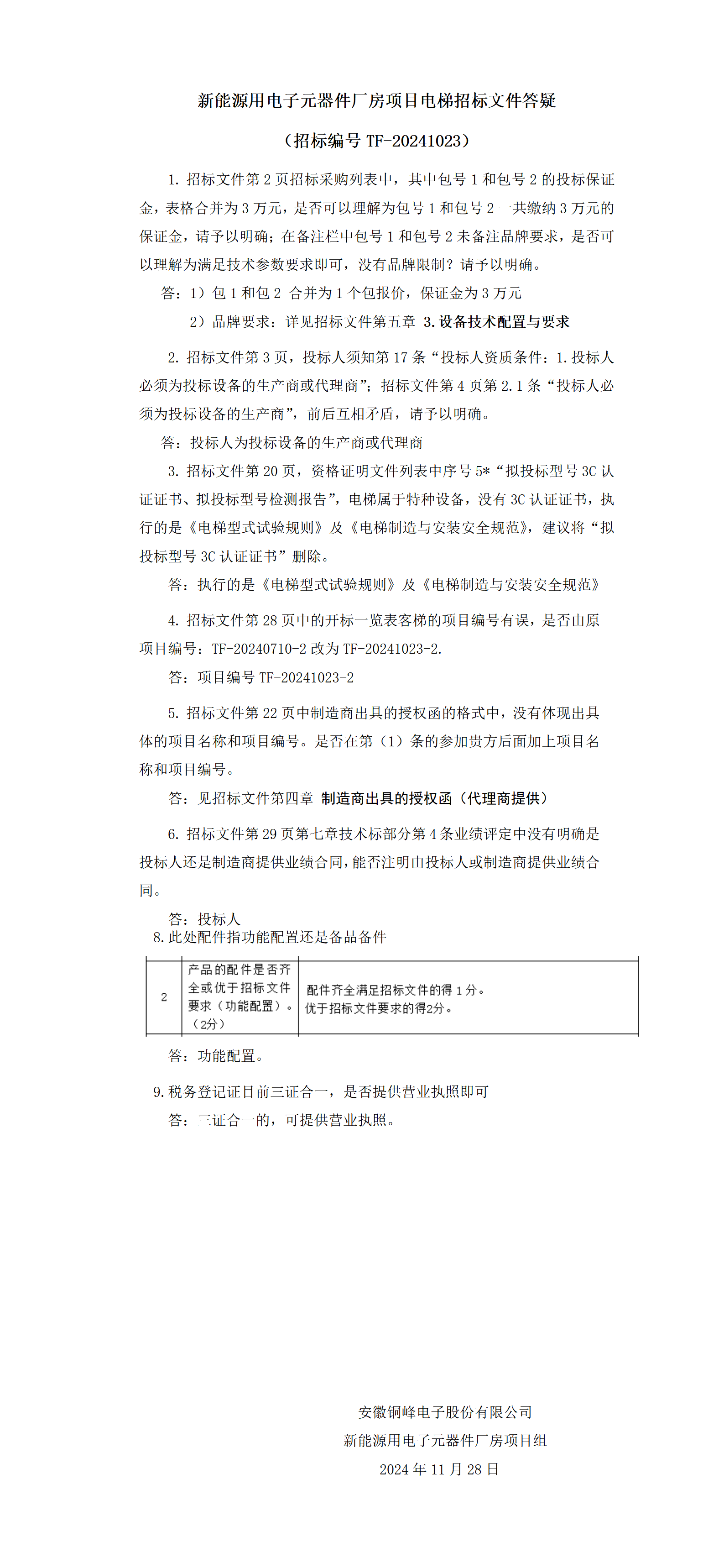 新能源用電子元器件廠房項(xiàng)目電梯招標(biāo)文件答疑(招標(biāo)編號(hào)TF-20241023)
