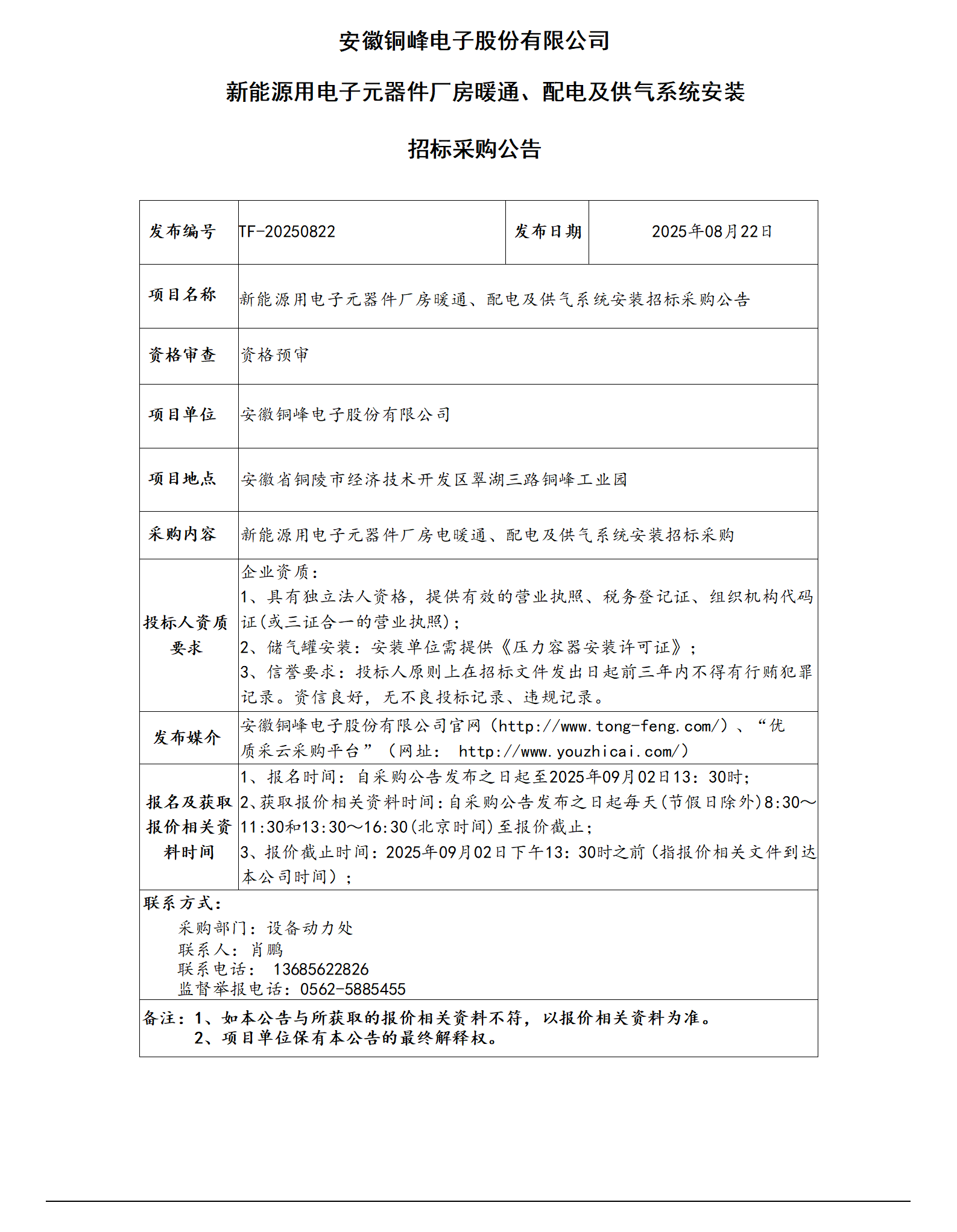安徽銅峰電子股份有限公司 (新能源用電子元器件廠房凈化工程 招標公告)_01