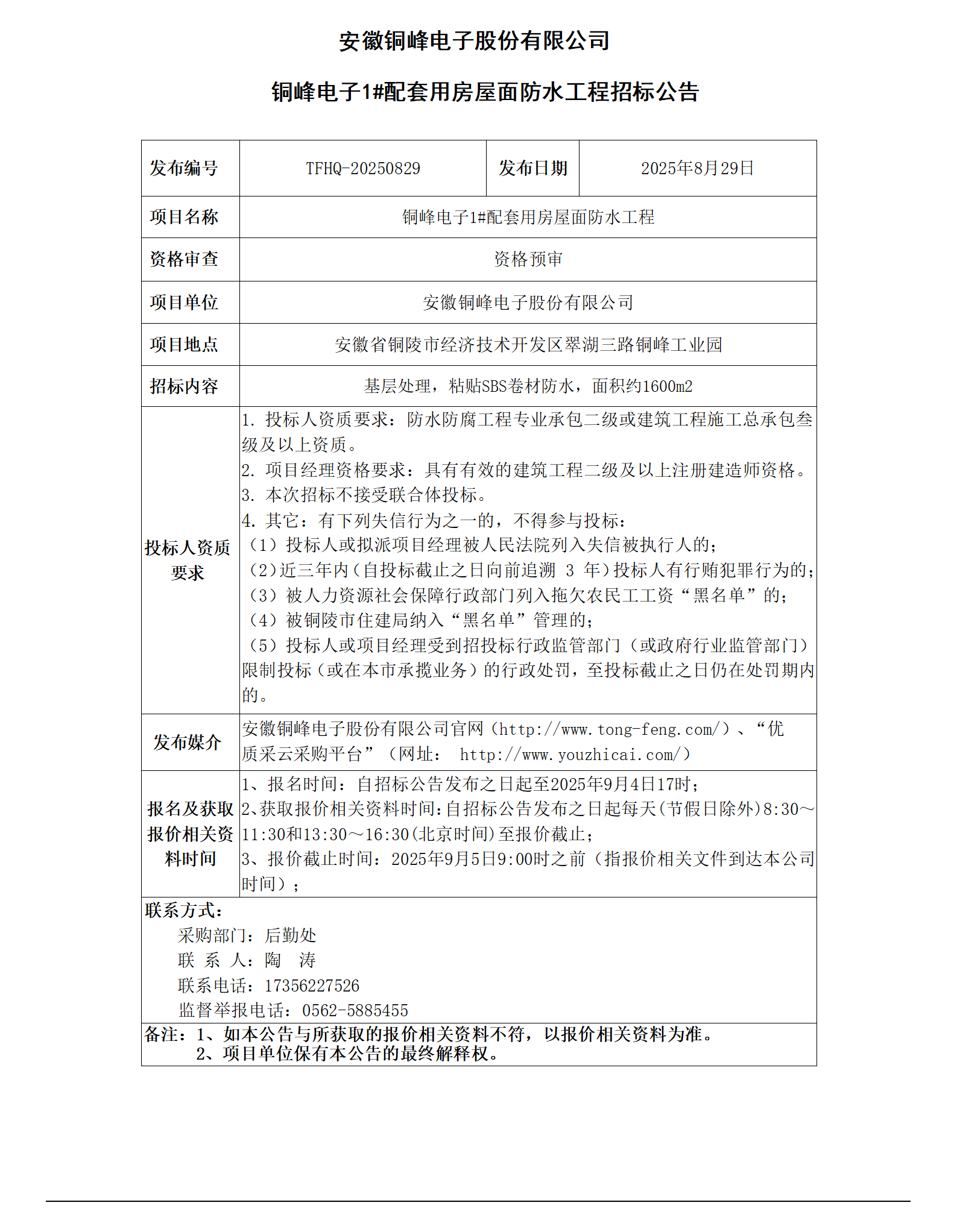 安徽銅峰電子股份有限公司 (銅峰電子1#配套用房屋面防水工程 招標(biāo)公告)_01