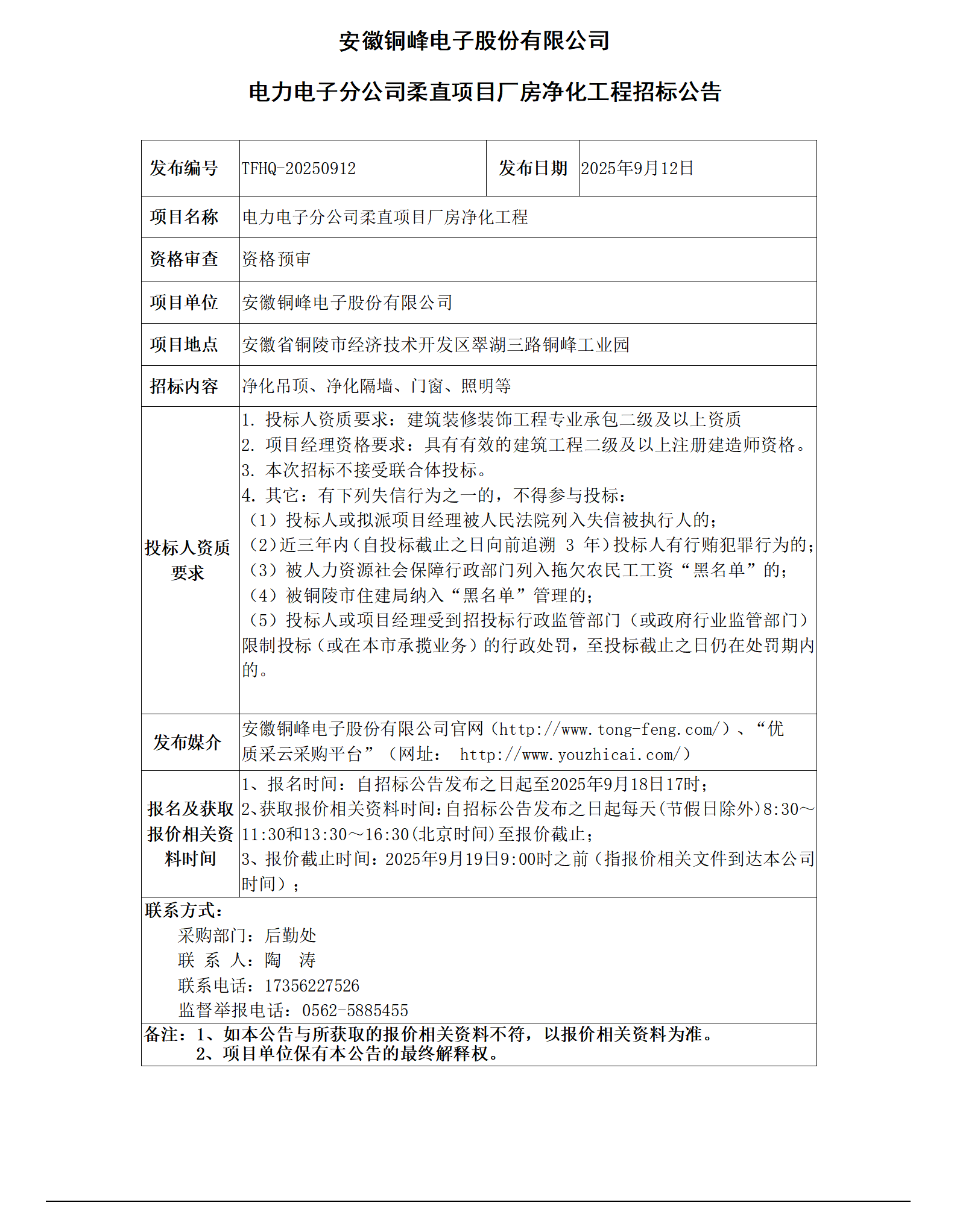 01安徽銅峰電子股份有限公司 (電力電子分公司柔直項目廠房凈化工程 招標公告)_01