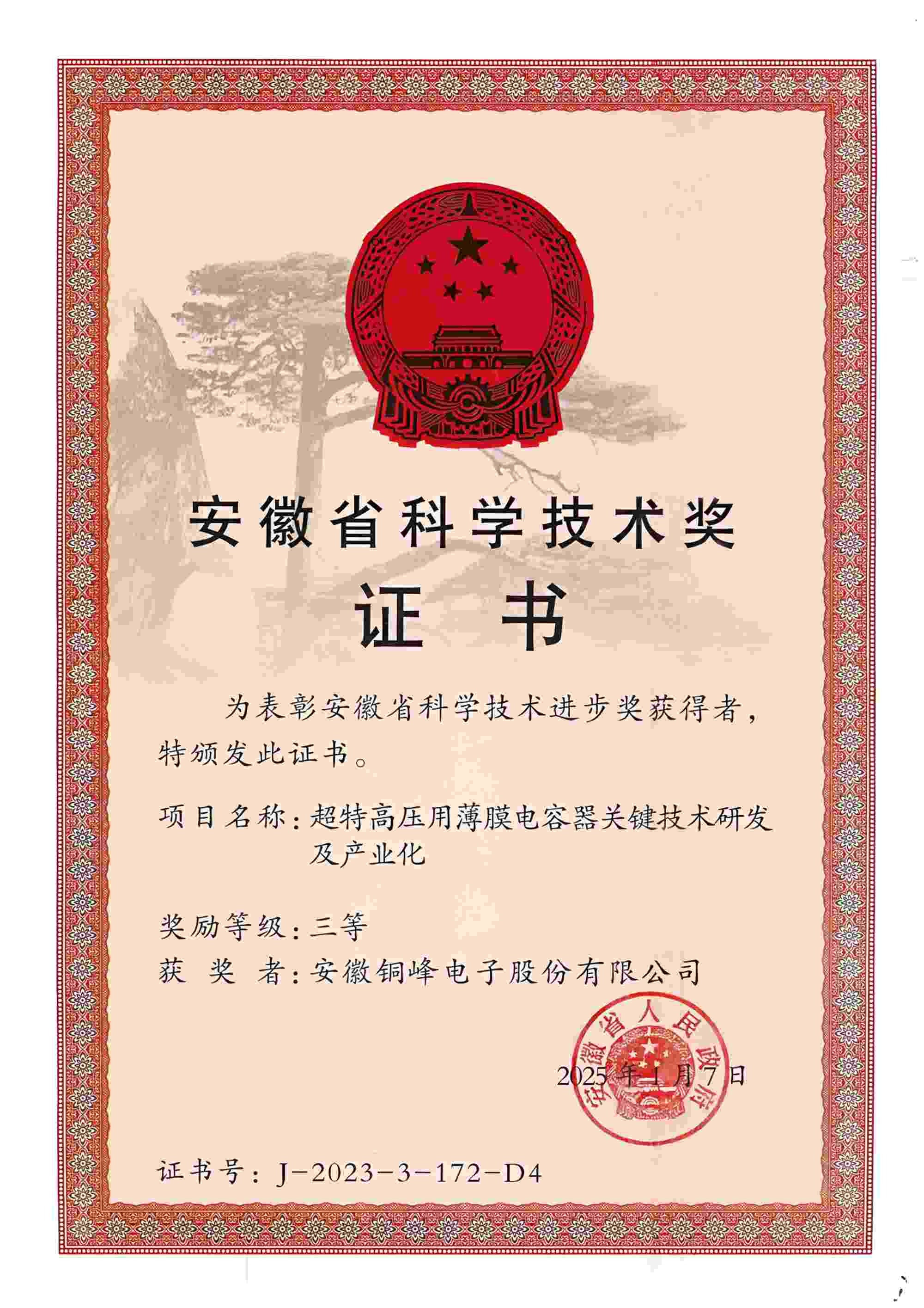 5月12日上午,安徽省科技創(chuàng)新大會(huì)召開,隆重表彰2023年度安徽省科學(xué)技術(shù)獎(jiǎng)勵(lì)獲獎(jiǎng)人員和組織。公司與國網(wǎng)安徽省電力有限公司、國網(wǎng)智能電網(wǎng)研究院有限公司、西安交通大學(xué)等單位聯(lián)合完成的“超特高壓用薄膜電容器關(guān)鍵技術(shù)研發(fā)及產(chǎn)業(yè)化項(xiàng)目”榮獲安徽省科技進(jìn)步三等獎(jiǎng)。
